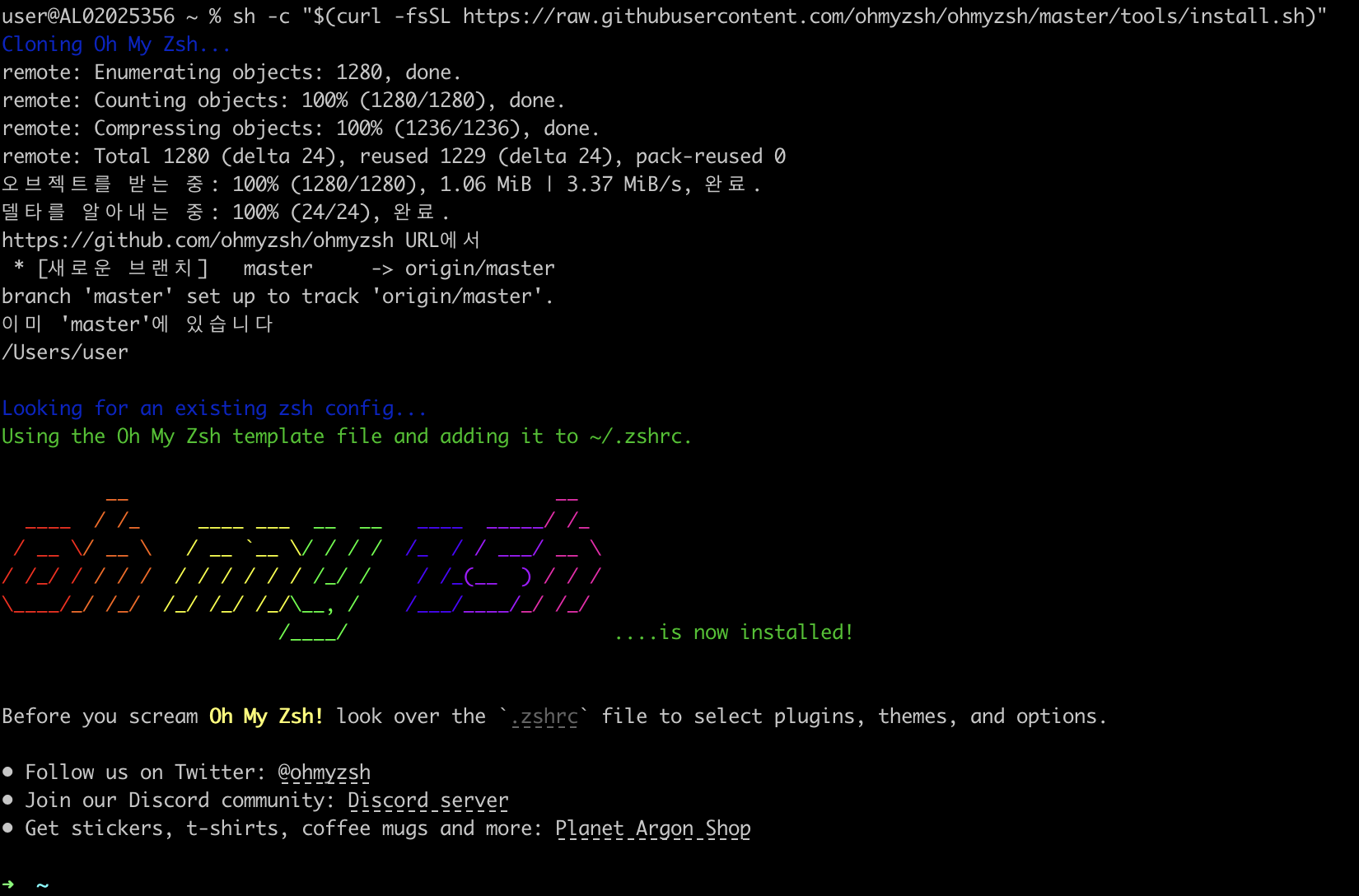 $ sh -c "$(curl -fsSL https://raw.githubusercontent.com/ohmyzsh/ohmyzsh/master/tools/install.sh)"