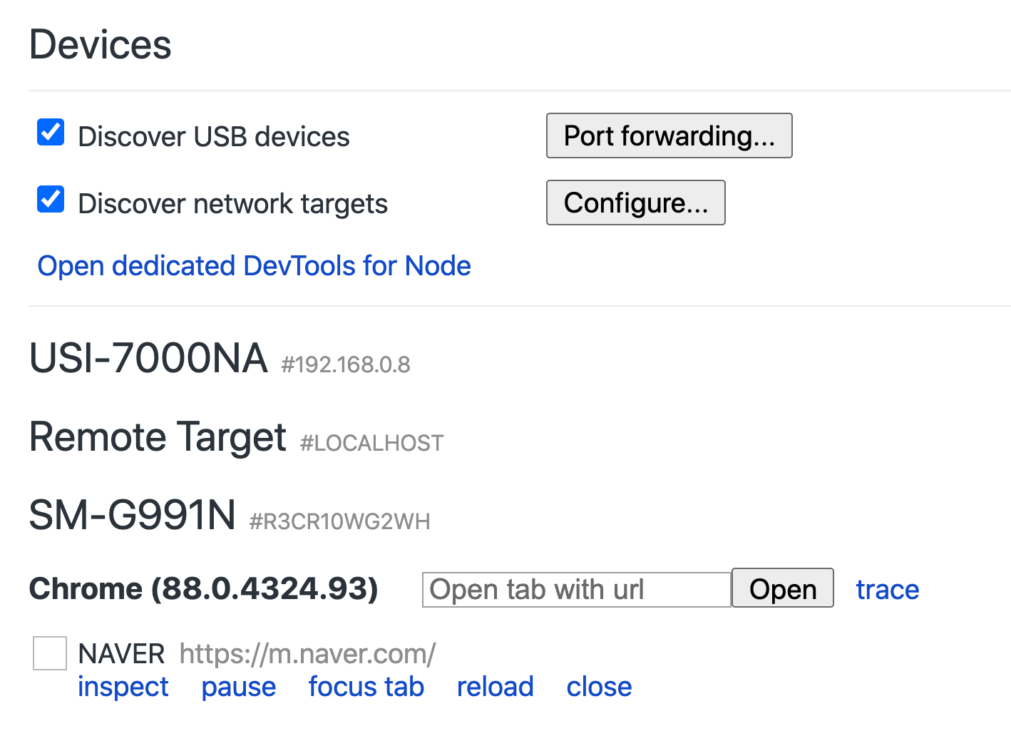 기기와 개발장비를 USB로 연결한 후에 `chrome://inspect/#devices`에 접근하면 기기가 노출됩니다.