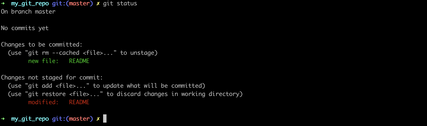 위에서 확인하듯 명령이 실행되면 README 파일이 Tracked 상태이면서 커밋에 추가될 Staged 상태라는 것을 확인 할 수 있음