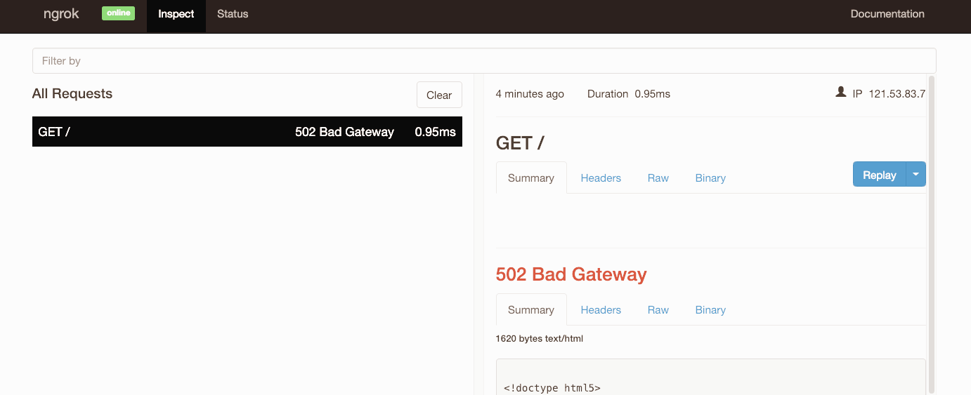 추가적으로 ngrok은 히스토리를 확인할 수 있는 web interface를 제공하는데요.