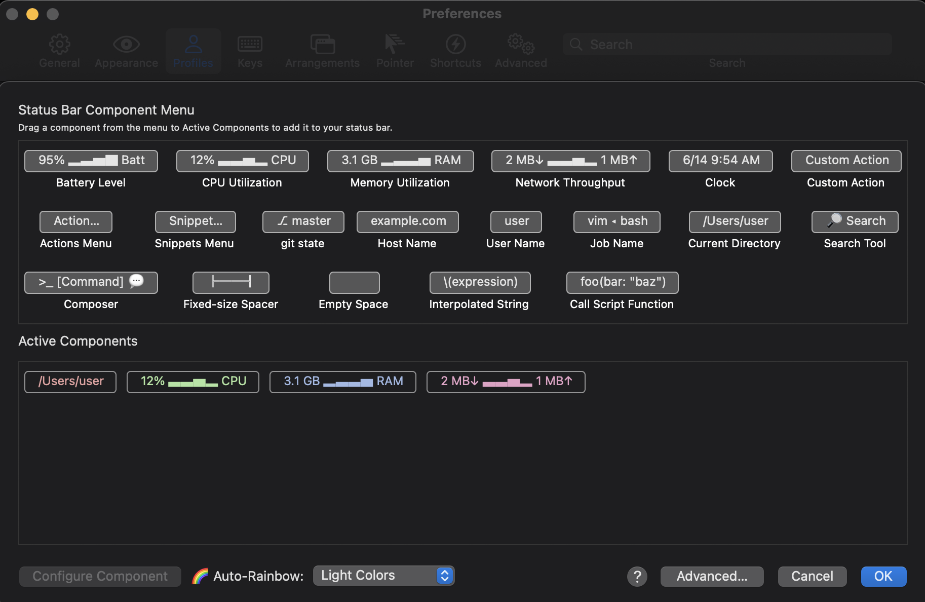 Status Bar는 Terminal에서 디바이스의 다양한 상태값을 볼 수 있도록 도와주는 설정입니다. 들어가는 순서는 좌상단 iTerm2 > Preferences... 메뉴로 들어가 Profile > Session > Status bar enabled를 활성화 해주면 됩니다.