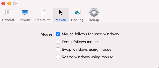 우선 시작전에 (Mouse) Focus 기능을 활성화해주겠습니다. Preferences > Mouse 탭에서 Mouse follows focused windows를 체크해주세요. 해당 기능을 활성화해주면 window간 focus 전환시 마우스가 같이 이동하도록 합니다.