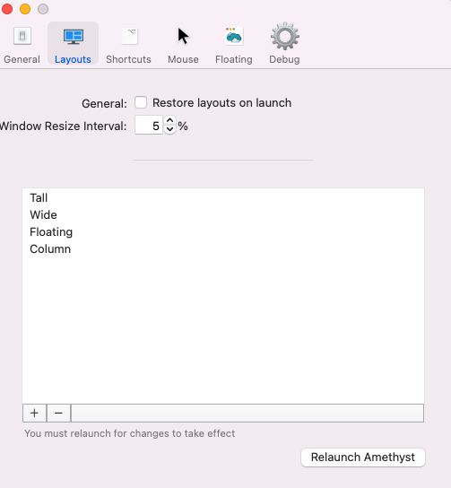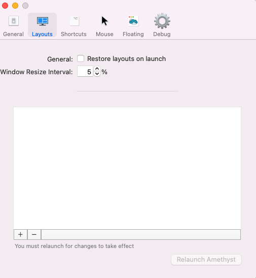 Amethyst는 Layout에 관련한 기능도 제공하고 있는데요. 개인적으로는 Layout에 관련한 기능은 다른 파워풀한 앱들이 많아서 따로 사용하지 않고 있습니다. Preferences > Layout 탭에 진입하여 관련 기능을 모두 삭제해주면 기본으로 적용된 Layout 기능이 삭제됩니다.