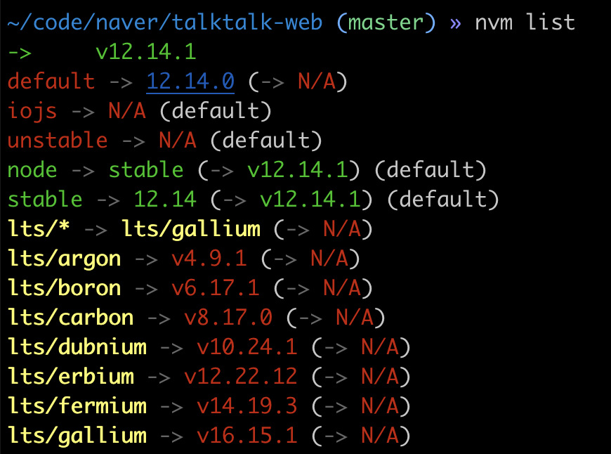 $ nvm list # 설치된 노드버전을 확인합니다.